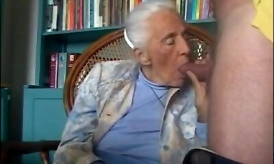 Kinky ugly secretary Pauline squats down to suck two hot tools for sticky cum